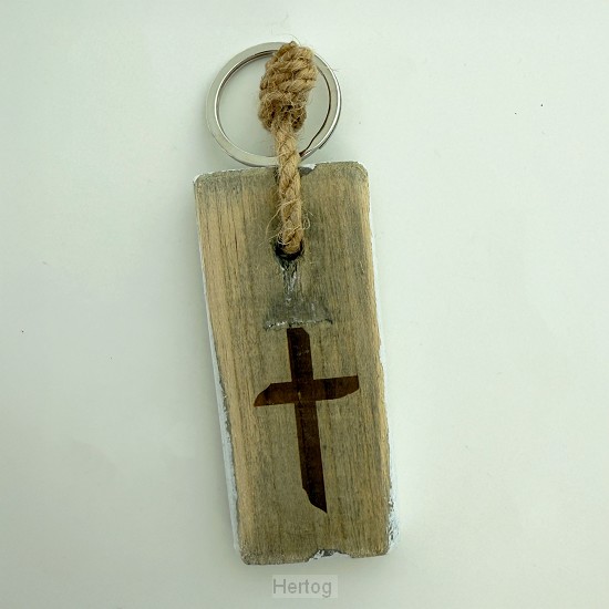 - Houten sleutelhanger met opdruk 'Kruis' Met ring en touw