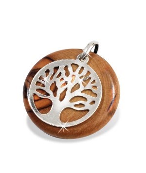 IPC - Prachtig generfd olijfhouten hanger, 30 mm. waarop de zilveren levensboom bijzonder mooi uitkomt.