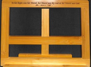 - Lezenaar van bamboe met tekst: In het begin was het Woord