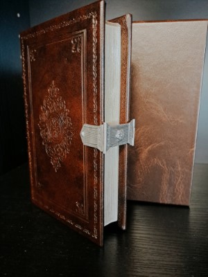 Antiek leren kaft, donkerbruin met zilver slot, streep met bloem.